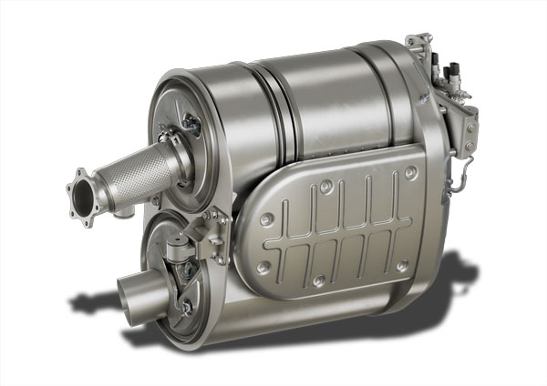 For the reduction of the soot gathered in the SMF®, the well-proven HJS-SMF® technology with passive regeneration is used. Thus, the upstream-connected oxidation catalyst converts the nitric oxide (NO) present in the exhaust gas into nitrogen dioxide (NO2). Then the particle filter uses the generated nitrogen dioxide (NO2) for the continuous combustion of the soot residues (soot oxidation).